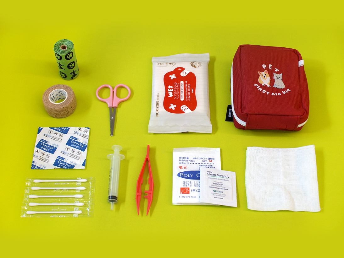 산책 용품과 응급 처치 도구를 한 번에 담은 반려동물 전용 구급키트입니다.