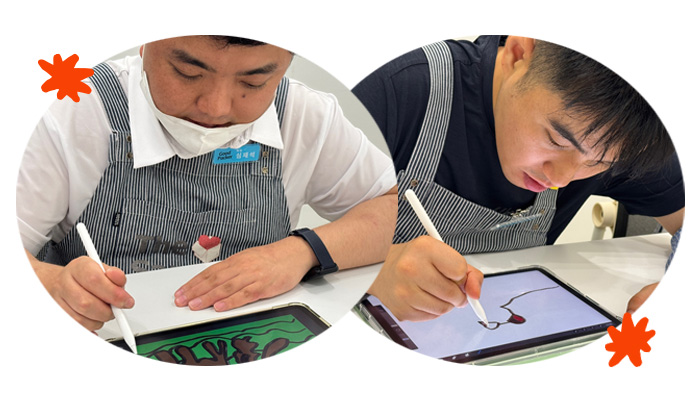 그래서 2025년, 작가들과 함께 아이패드 드로잉이라는 새로운 도전을 시작했답니다! 선 긋기부터 색상 고르기, 채색까지 하나하나 배워나갔는데, 예상보다 훨씬 빠르게 익혀가는 작가들의 모습에 감동을 받았어요.