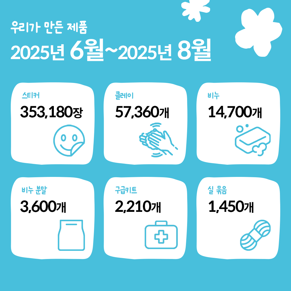 뜨거운 여름에도 굿패커는 다양한 작업을 진행했어요. 이제는 익숙해져 베테랑이 된 스티커와 클레이 작업, 산뜻한 향기 가득한 비누, 문구 세트 포장, 보킷만의 시그니처 제품인 구급키트까지! 하나하나 열심히 작업하며, 발달장애인과 시니어 선생님의 따뜻한 마음도 함께 담았답니다. 우리가 일할 수 있는 원동력은 함께 하는 기업들과 응원해주시는 여러분들이 있기 때문입니다.💚 |