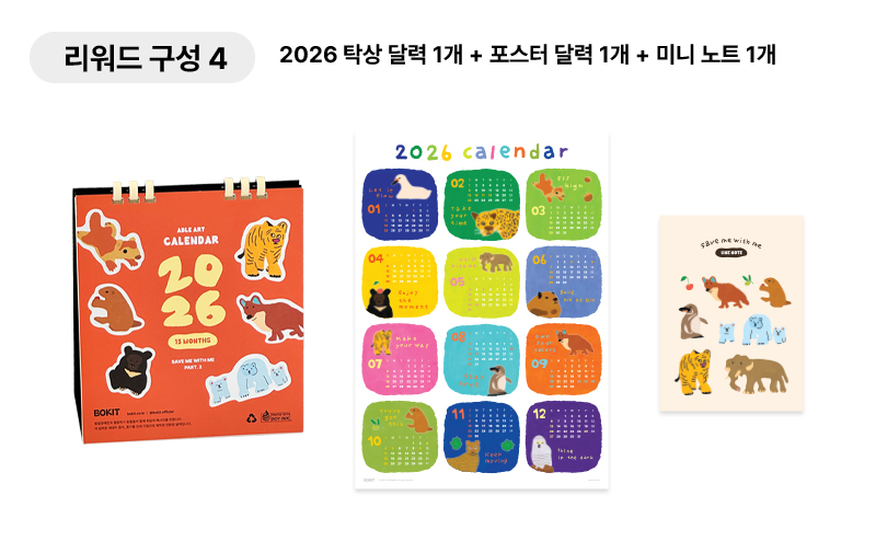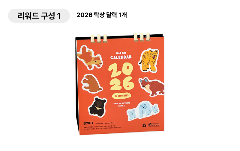 콩기름 인쇄 기법과 재생지를 사용하고, 재활용 가능한 종이 링 달력으로 제작해 환경을 생각했습니다. 또한 미니 노트와 포스터 달력은 환경을 배려하면서도 실용성을 더한 특별한 아이템입니다. 여러분의 소중한 참여가 지구와 모두에게 더 나은 내일을 만드는 시작이 됩니다.✨